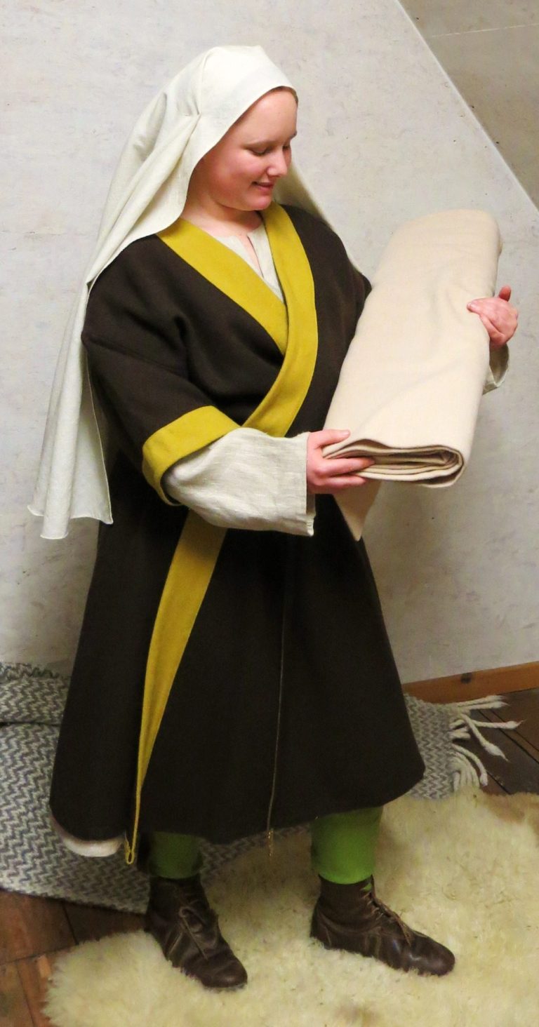 Das kurzärmlige Mantelkleid oder auch der Klappenrock aus Wolle hat zwei spitz zulaufende sich weit überlappende Vorderteile. Der Saum ist leicht durch Keile ausgestellt. Nach Wunsch kann man das Gewand abfüttern. Die kontrastfarbenen Besätze wie sie hier abgebildet sind, kann man weglassen oder durch Borten ersetzen. Auch lange Ärmel sind möglich, falls es ein wärmeres Gewand sein soll.