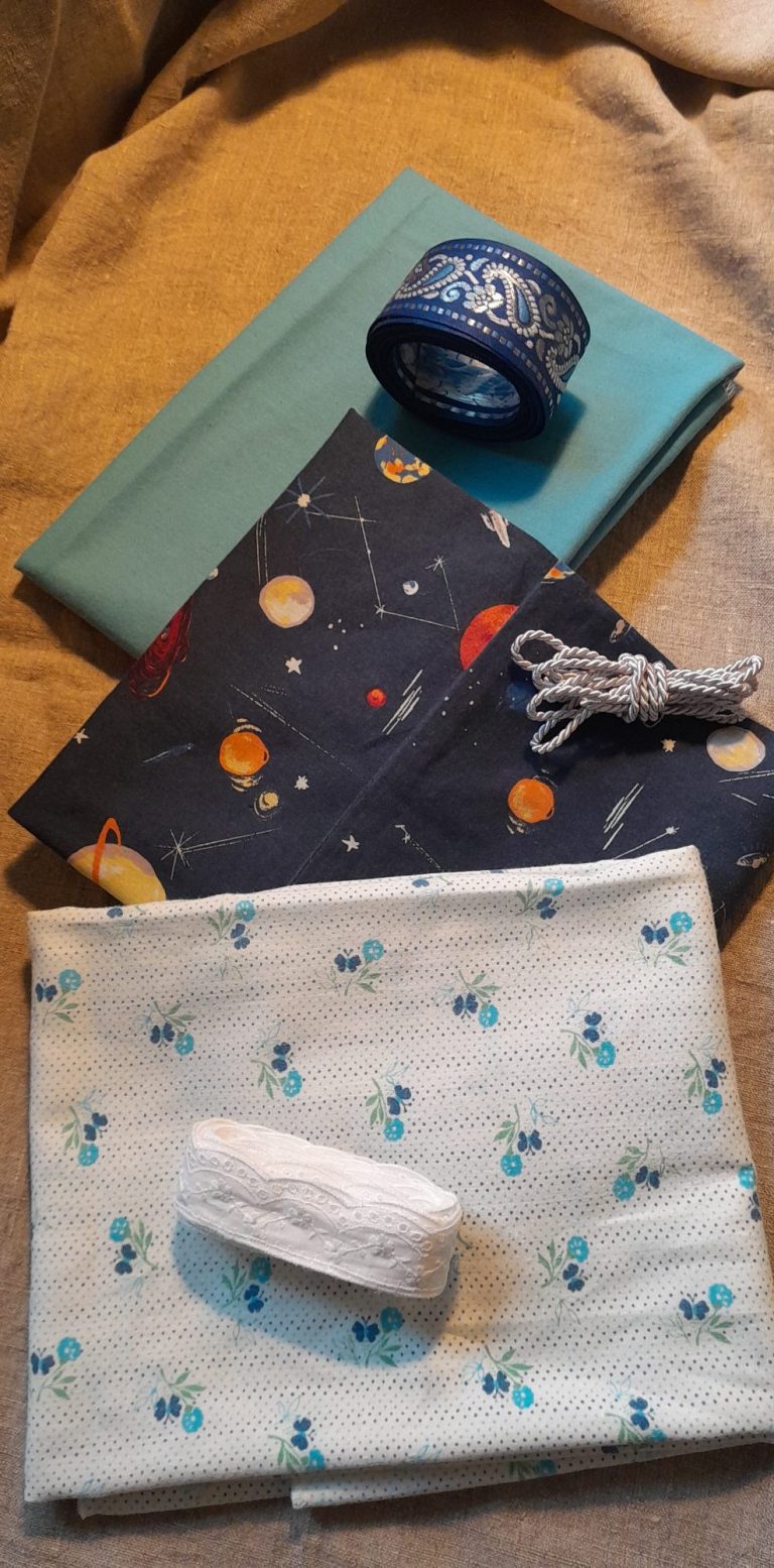 In diesem Set sind drei verschiedene Stoffstück in verschiedenen Größen und drei verschiedene Bänder passend zum Stoff.